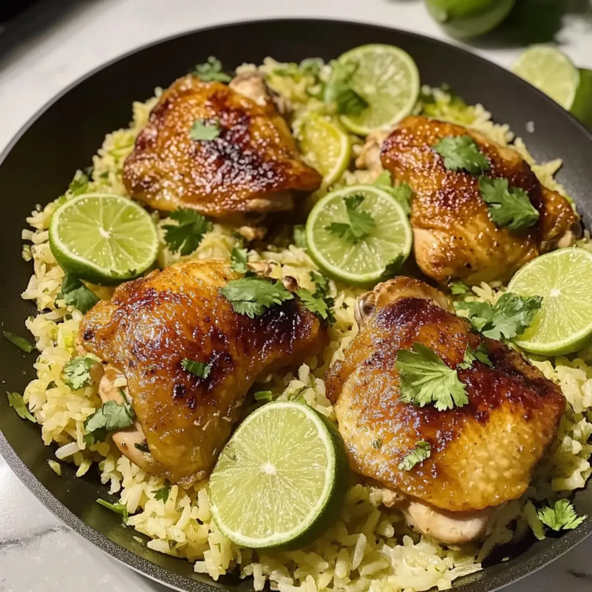 Ein Pfannen Koriander Limetten Hühnchen und Reis Rezept