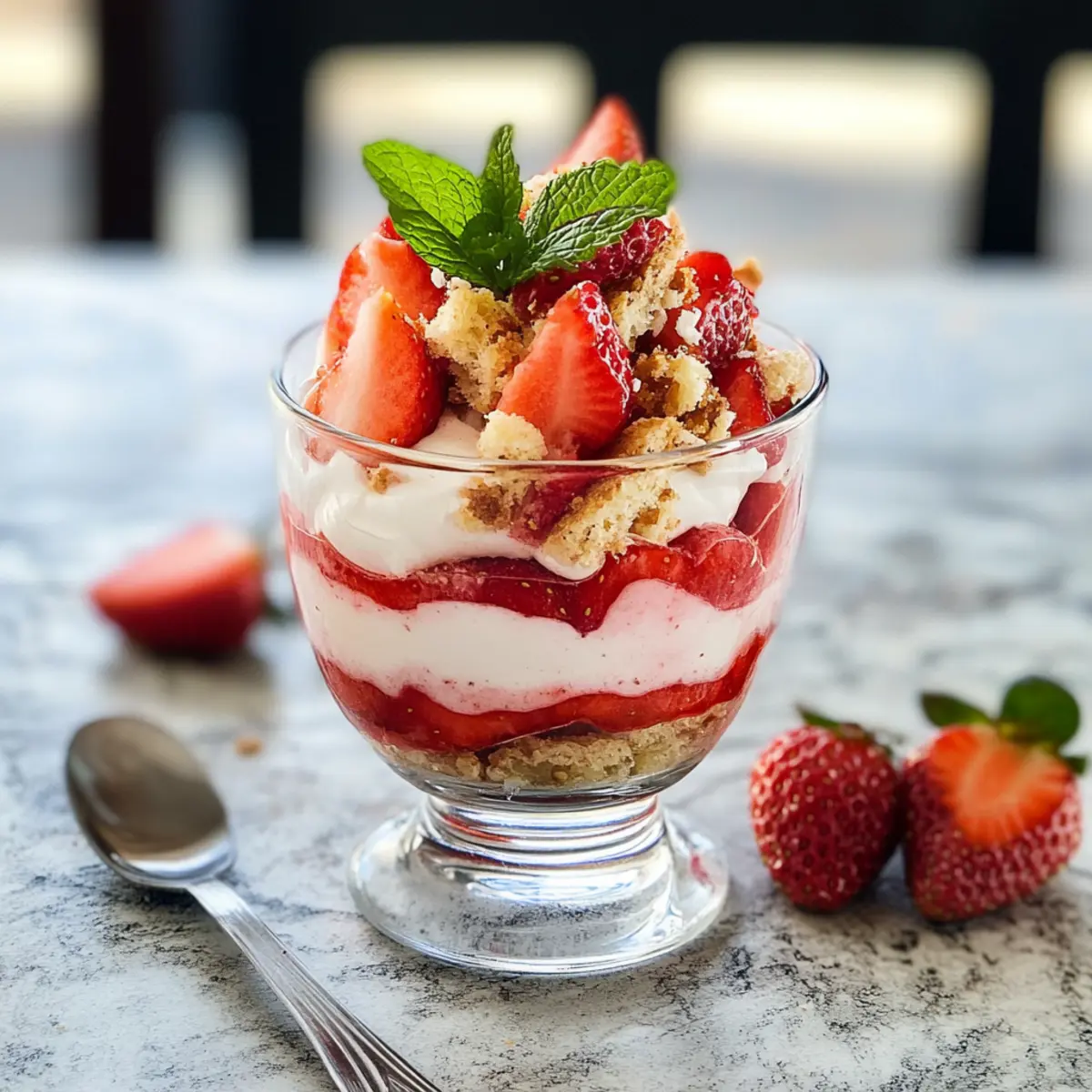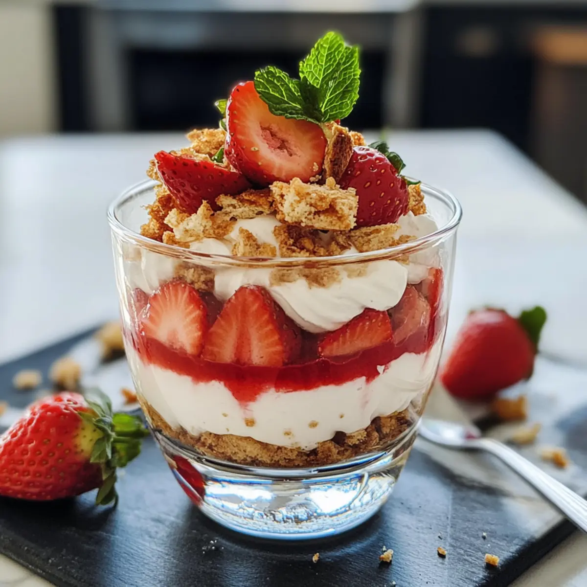 Wasche und entblättere die Erdbeeren. Püriere ein Drittel der Erdbeeren mit frischem Zitronensaft, Amaretto und Zucker, bis eine glatte Masse entsteht. Die restlichen Erdbeeren in kleine Stücke schneiden und mit gehackter Minze vermischen. Diese fruchtige Schicht bringt frische Aromen in dein Dessert.