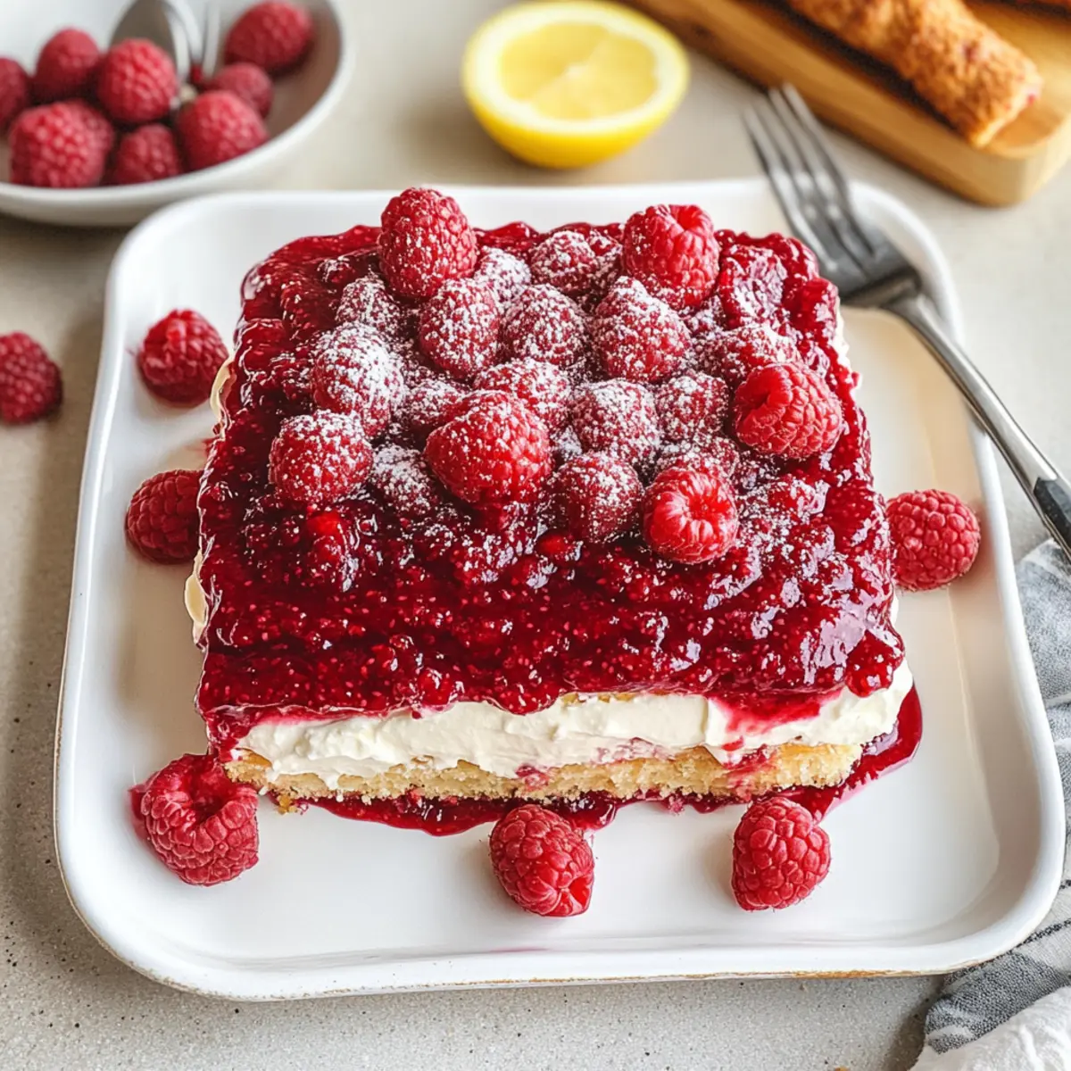 Beim Servieren nimmst du das Tiramisu aus dem Kühlschrank, entfernst die Folie und gibst die restliche Himbeermarmelade gleichmäßig darüber. Dekoriere das Dessert mit frischen Himbeeren und Zitronenscheiben für einen eleganten Touch. Das leuchtende Aussehen und der fruchtige Duft werden sicherlich alle begeistern!