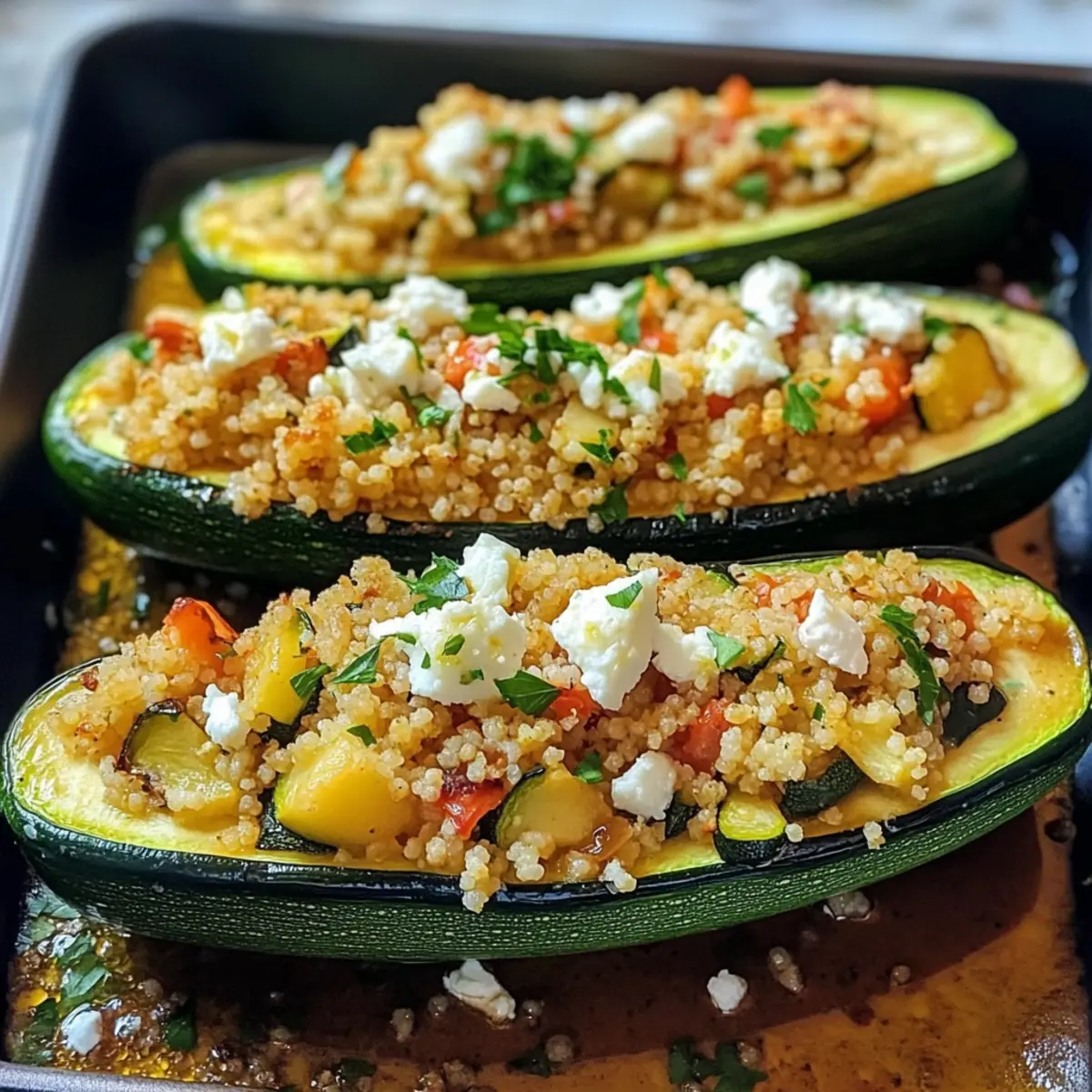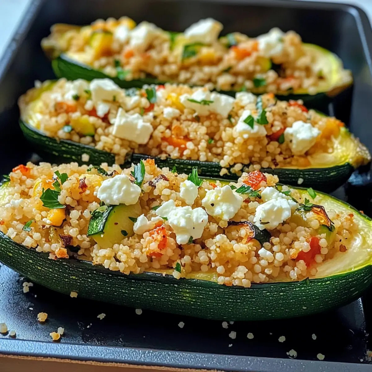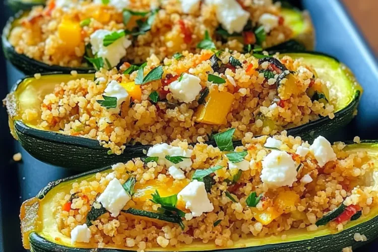 Genießen Sie gefüllte Zucchini mit Couscous & Feta – eine gesunde, vegetarische Delikatesse voller Aromen.