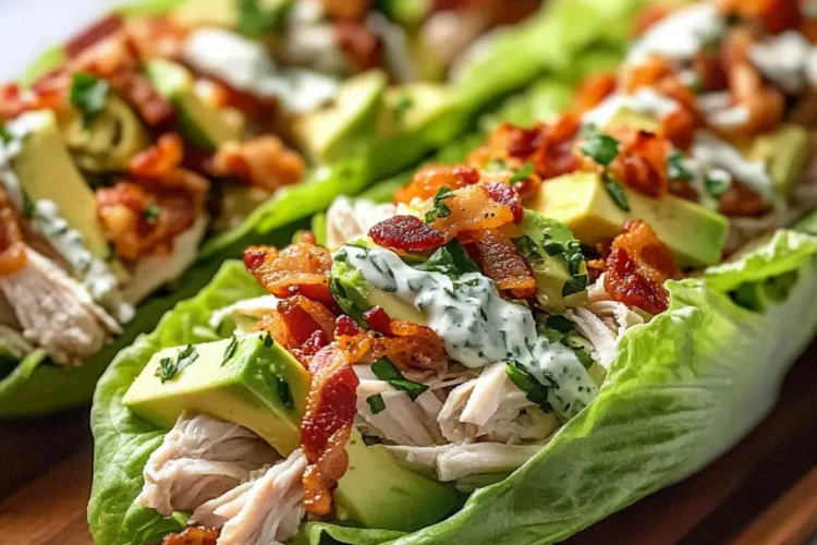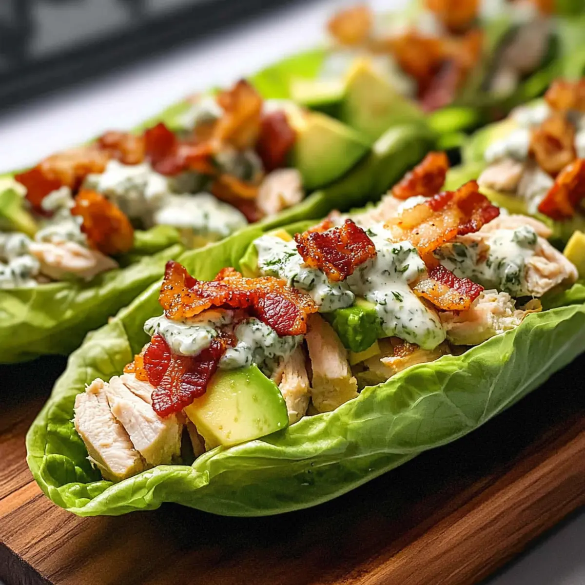 - Salatboote zusammensetzen: Fülle die Salatblätter mit Hähnchen, Speck und Dressing.