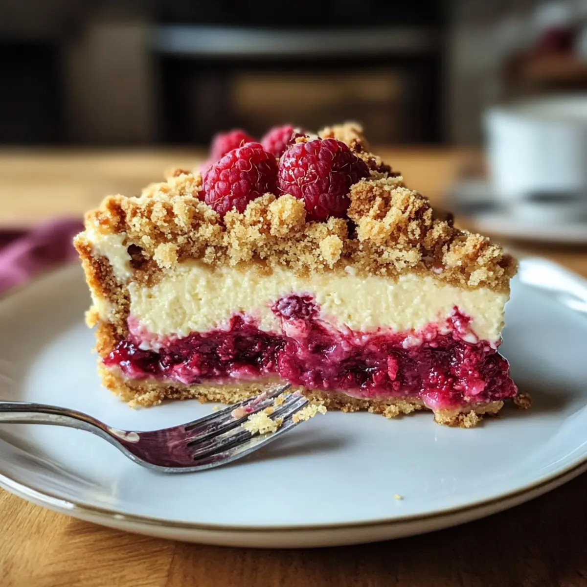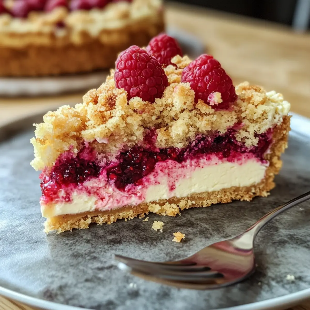 Ein leichter Himbeer Streusel Kuchen mit cremiger Joghurt Käsekuchen-Füllung, perfekt für Sommerfeiern und geschäftige Tage.