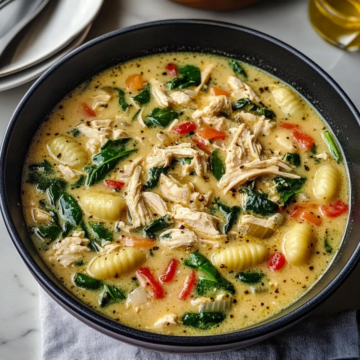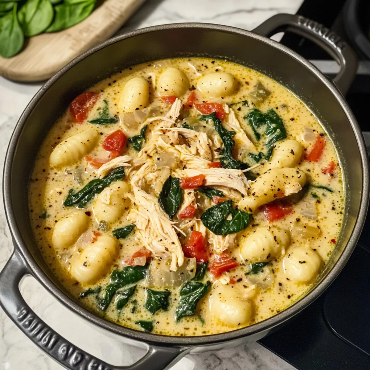 Rühre das zerfledderte Rotisserie-Hühnchen und die Gnocchi in die Suppe ein. Koche die Mischung für etwa 5 Minuten, bis die Gnocchi zart sind und an die Oberfläche steigen. Die Suppe sollte nun eine wunderschöne, cremige Konsistenz annehmen.