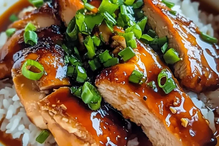 Schneide die Frühlingszwiebeln in feine Ringe und streue sie großzügig über das Gericht. Diese aromatische Garnitur gibt nicht nur einen frischen Crunch, sondern macht das Karamellisierte Soja-Hühnchen in Knoblauch-Ingwer-Brühe mit Reis noch ansprechender. Genießen!