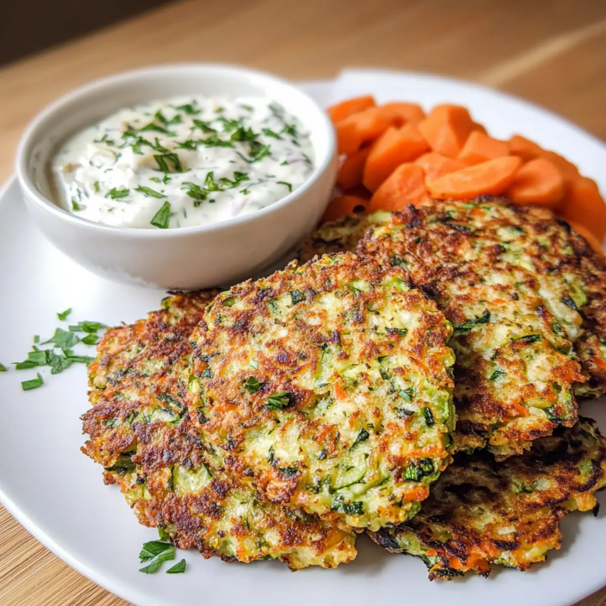- Serviere die warmen, knusprigen Gemüsepuffer auf einem Teller mit dem Knoblauchdip in einer kleinen Schüssel daneben.