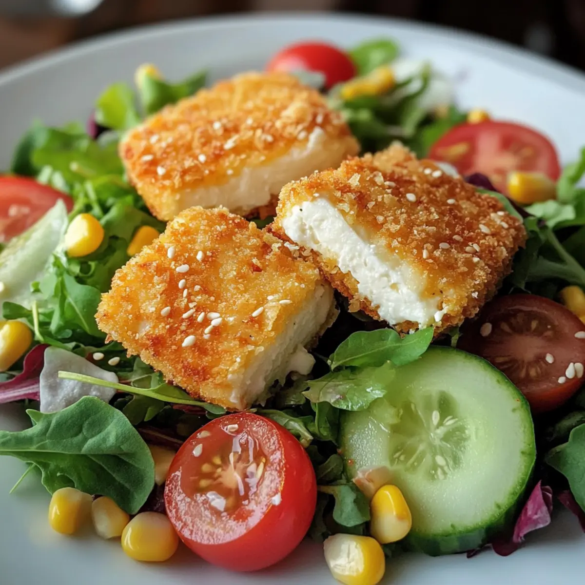 Verteile den bunten Salat auf Tellern und lege die heißen, panierten Fetakäse-Stücke darauf. Garniere nach Belieben mit frischen Kräutern oder zusätzlich Gemüse. Die Kombination aus knusprigem Fetakäse auf dem frischen Salatbett sieht nicht nur appetitlich aus, sondern sorgt auch für ein unvergessliches Geschmackserlebnis bei jedem Bissen!