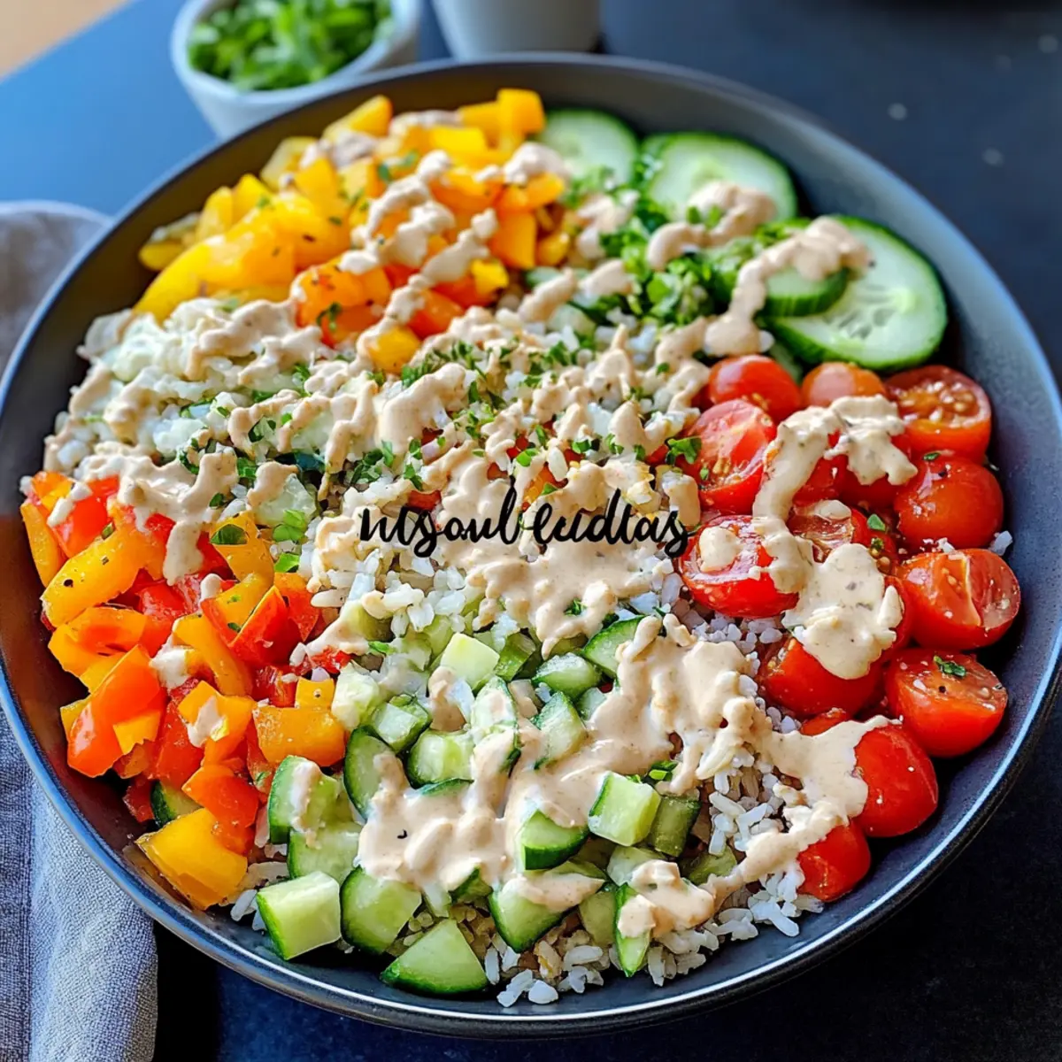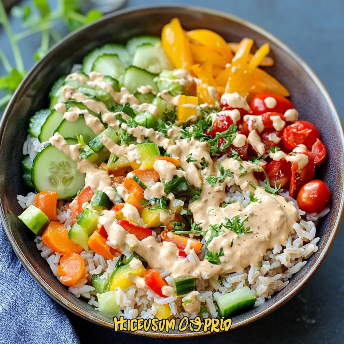 Dressing-Alternativen: Nutze Tahini oder eine leichte Vinaigrette anstelle von veganer Sahne. Diese Optionen bringen ganz unterschiedliche, köstliche Geschmäcker in deinen Reissalat.