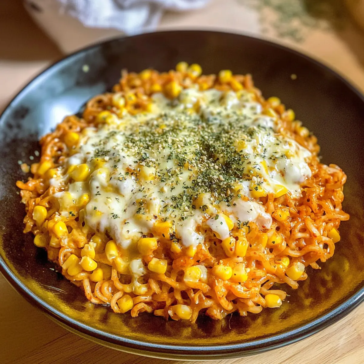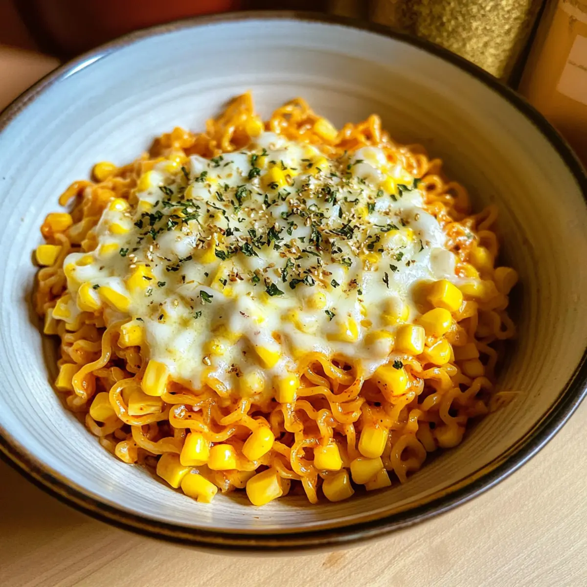 Wunderbare Geschmackskombination: Die Schärfe der Instantnudeln harmoniert wunderbar mit der süßen Cremigkeit des Maiskäses.