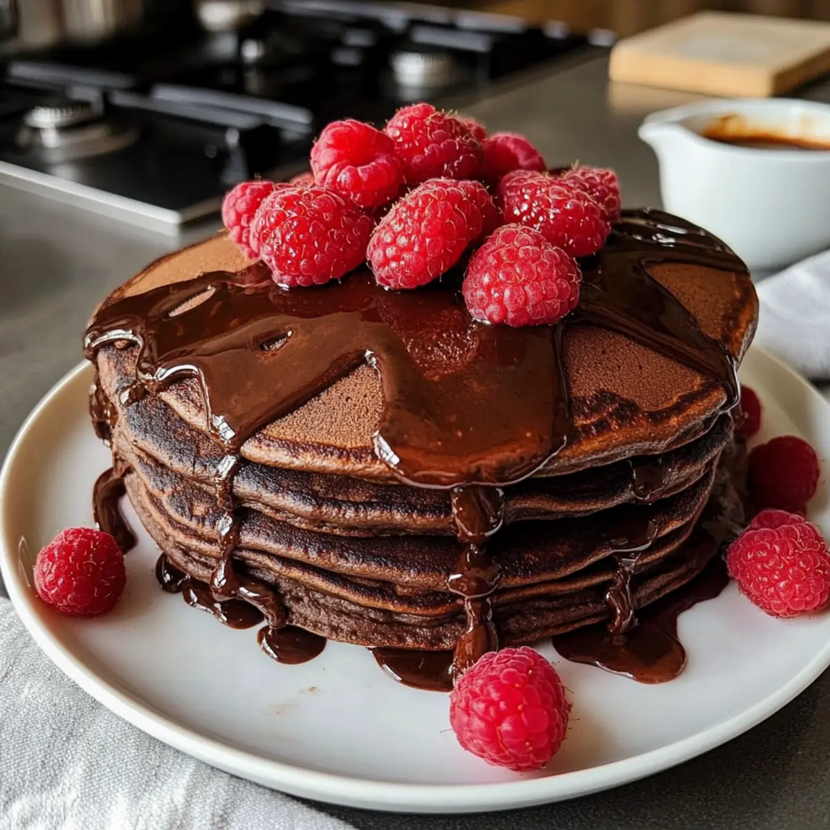 Staple die frisch gebratenen Schokoladen-Pfannkuchen auf einem Teller und betröpfle sie großzügig mit Schokosauce. Garniere die Pfannkuchen mit frischen Himbeeren, die eine köstliche Frische hinzufügen. Diese Schokoladen-Pfannkuchen sind perfekt für ein gesundes Frühstück oder als süßes Dessert und erfreuen sich großer Beliebtheit bei der ganzen Familie!