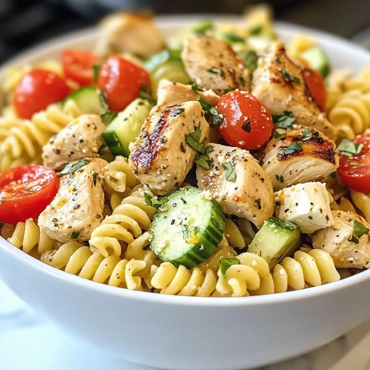 - In einer großen Schüssel vermenge die abgekühlte Pasta, Hähnchen, Kirschtomaten, Gurke, Zwiebel, Oliven und Feta. Gieße das Dressing über die Mischung und vorsichtig vermengen.